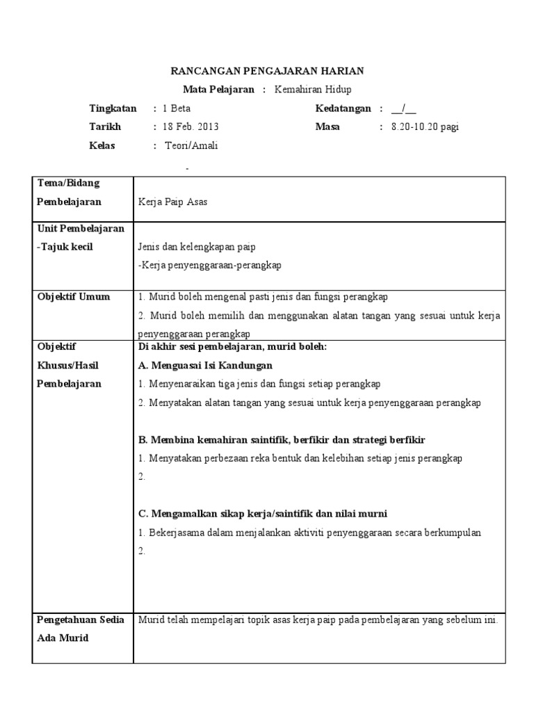 Khb Tingkatan 1 Kerja Paip Asas Teacher Aida Ms